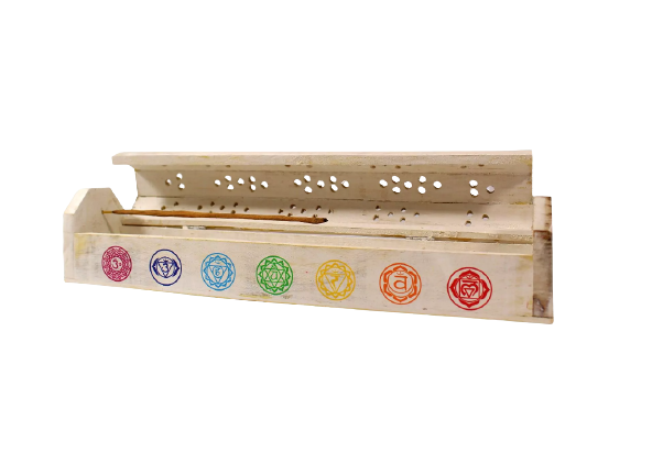 Een mooi witte 7 chakra wierookbrander van hout, geschikt om uw favoriete wierookstokjes en kegeltjes veilig te laten branden.