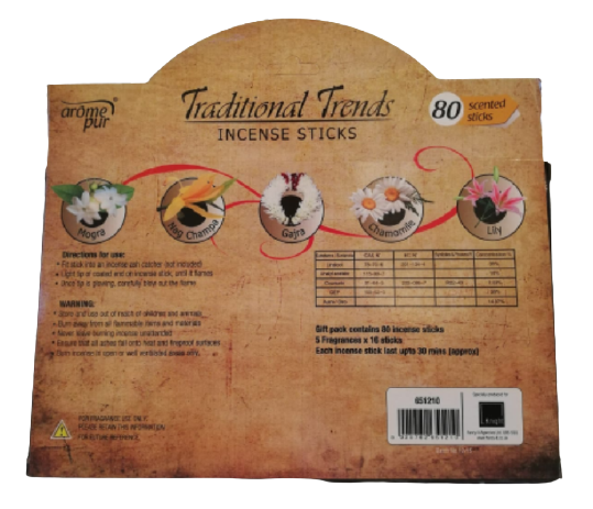 Leuke cadeauverpakking met verschillende fruitige geuren. Dit pakket bevat 5 kokers met ieder gemiddeld 16 stokjes. De volgende geuren zitten in dit pakket: